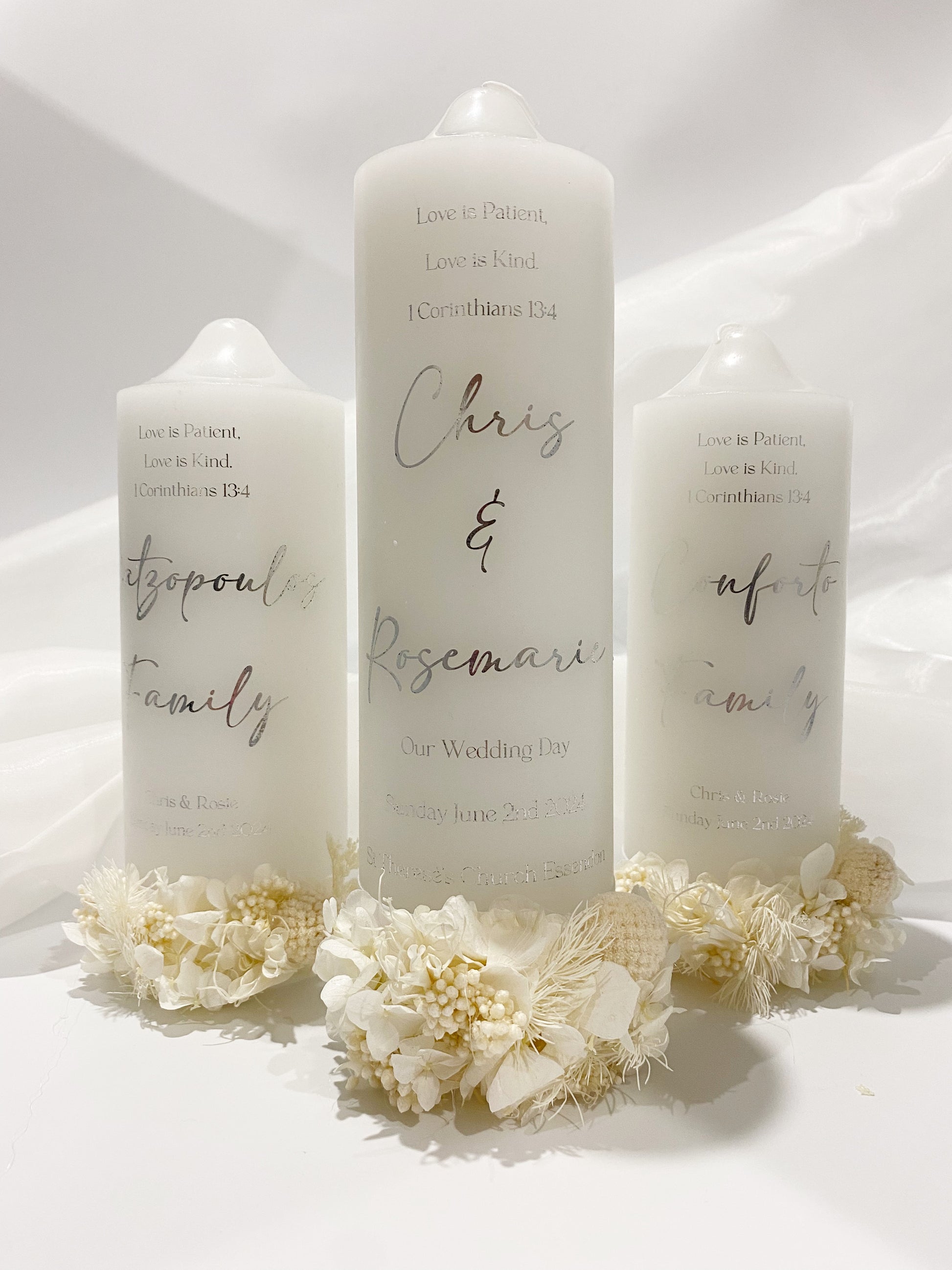 This elegant set includes one 25 cm candle and two 20 cm candles, perfect for wedding ceremonies or receptions. Crafted for a refined ambiance, these candles provide a warm, inviting glow that enhances any celebration. Their varying sizes allow for versatile arrangements, adding depth and sophistication to your décor. Ideal for creating memorable moments with a touch of classic charm.