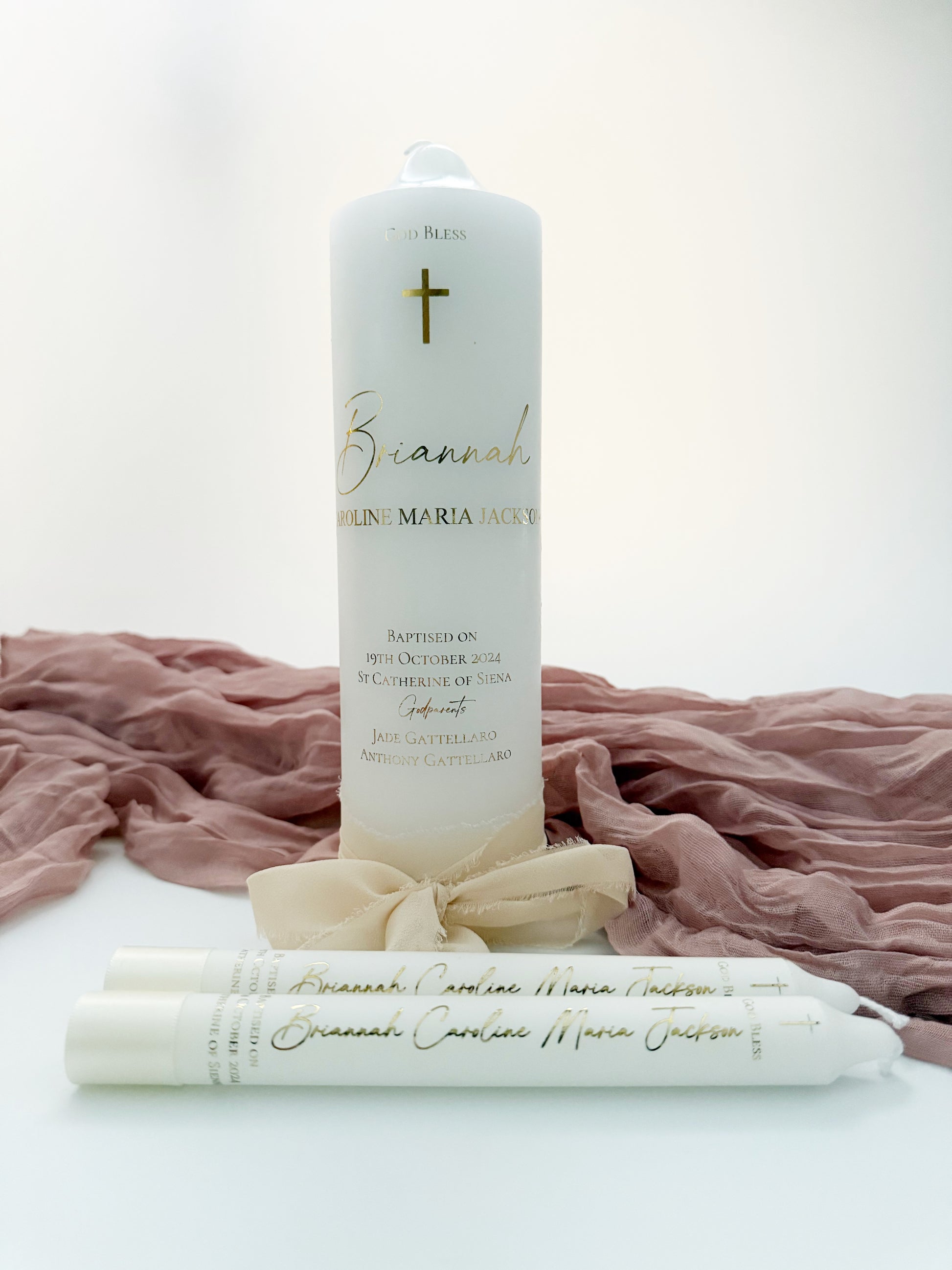 Indulge in the spiritual ambiance created by our 25cm candles, perfect for religious ceremonies and imbued with the sanctity of 2x godparent candles. A thoughtful gift for Christenings, Baptisms, and any other sacred occasions.