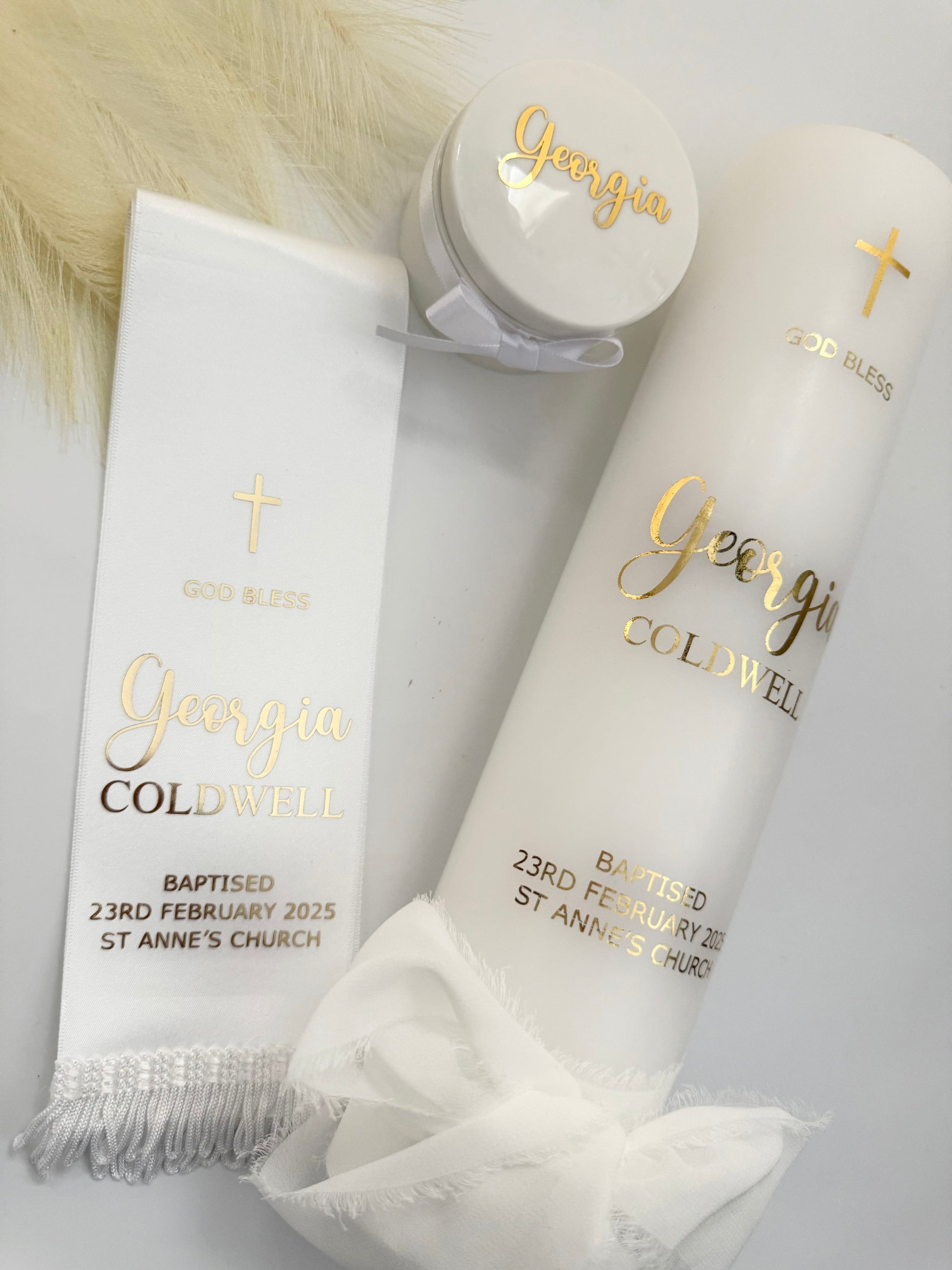 This 30cm candle is accompanied by an 80cm stole and trinket jar, making it the perfect addition to any baby occasion. Its elegant design is sure to make a statement, while the convenient size ensures ease of use and storage. Perfect for celebrating the arrival of a new little one.