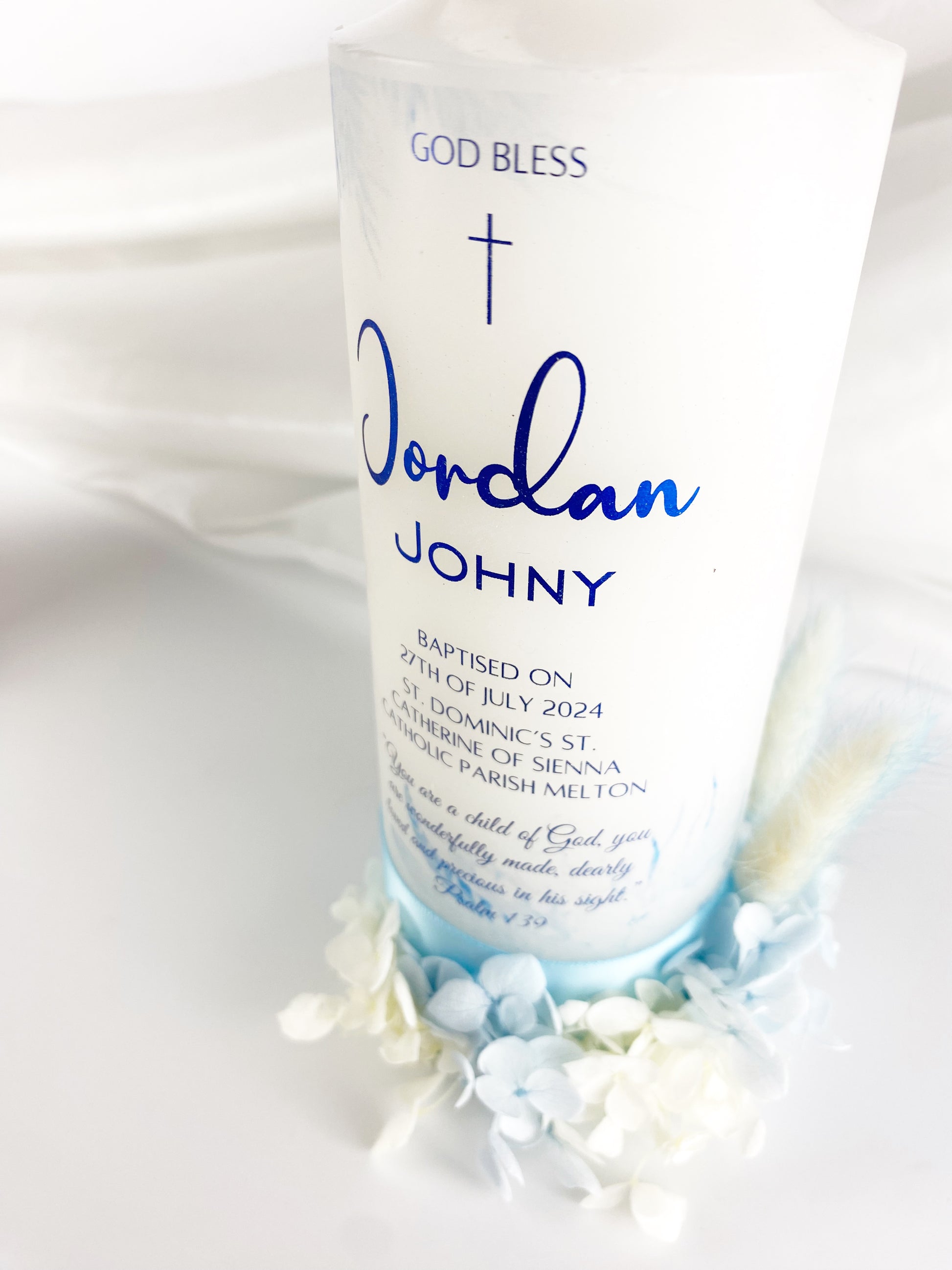 The Jordan Personalised Candle with Flowers is a must-have for any special occasion. This exquisite candle can be personalised to make it truly unique. Handcrafted with real flowers, it creates a warm and inviting ambiance while filling the air with a gentle floral scent. Perfect for weddings, birthdays, or any celebration.