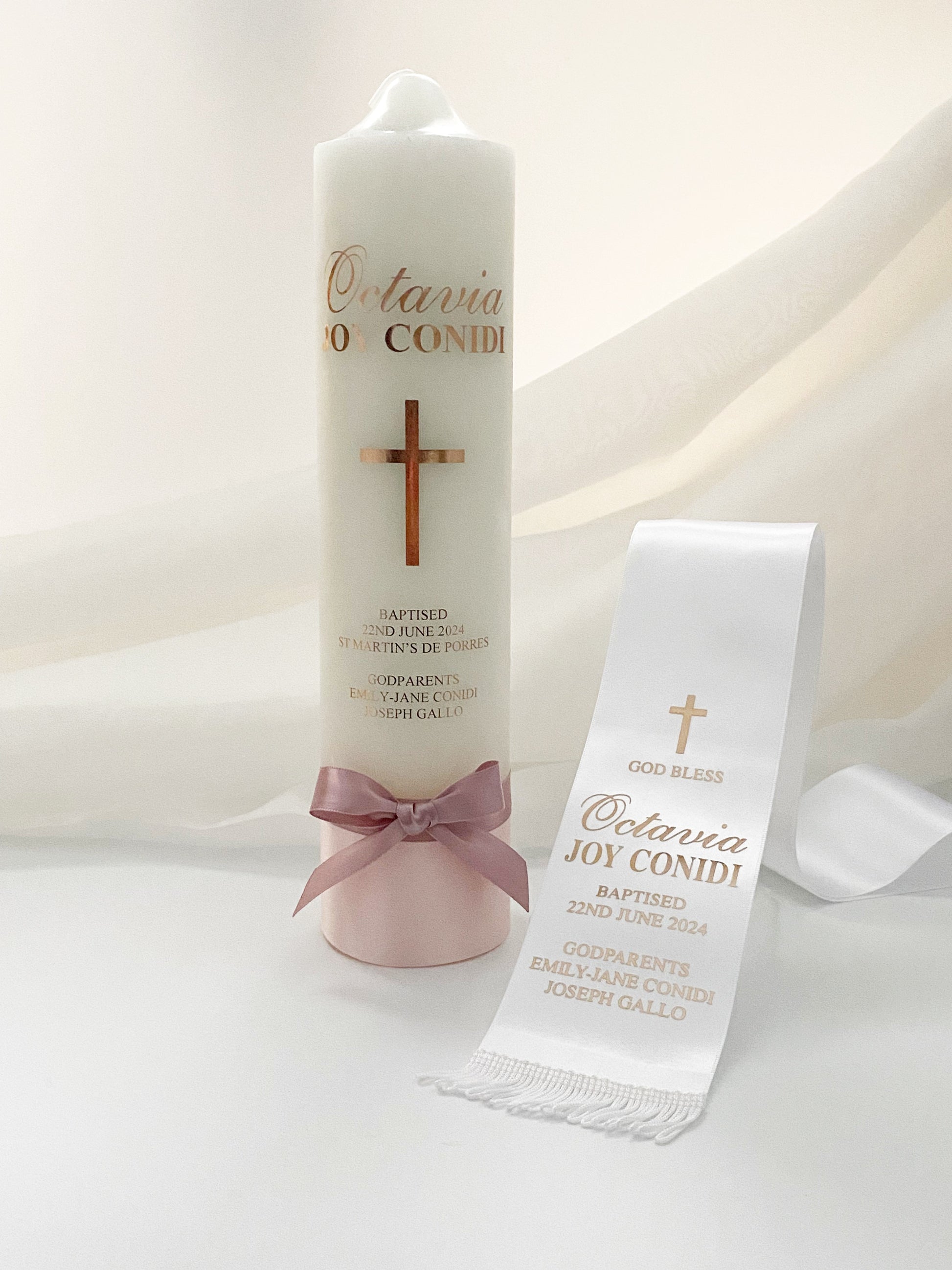 Add a special touch to your special occasions with our personalised 30cm candle and 80cm stole set. Perfect for weddings, baptisms, and more, our set is a unique way to celebrate your special moments. The perfect combination of elegance and personalisation, our set is a must-have for any memorable event.