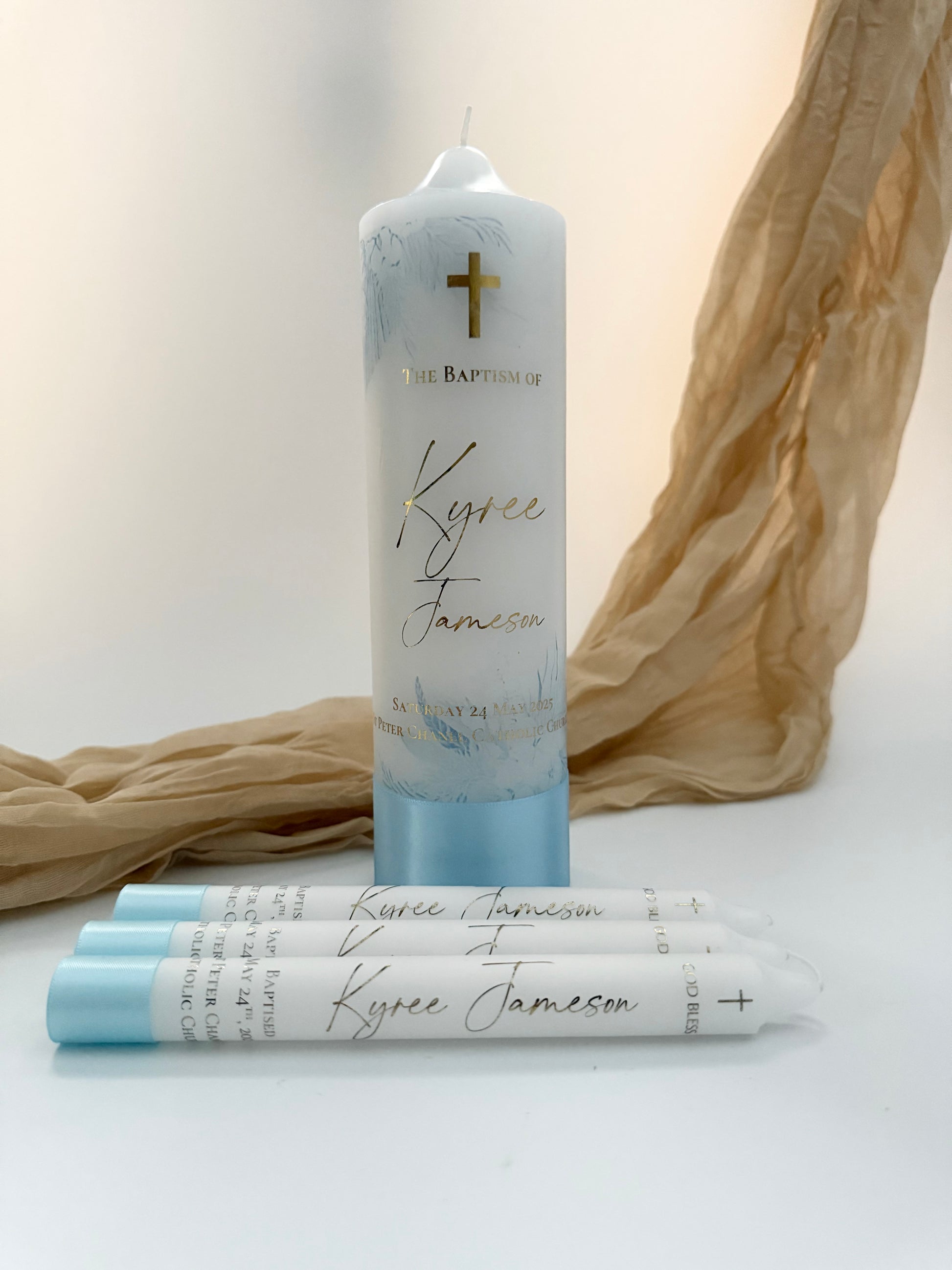 Indulge in the spiritual ambiance created by our 25cm candles, perfect for religious ceremonies and imbued with the sanctity of 2x godparent candles. A thoughtful gift for Christenings, Baptisms, and any other sacred occasions.