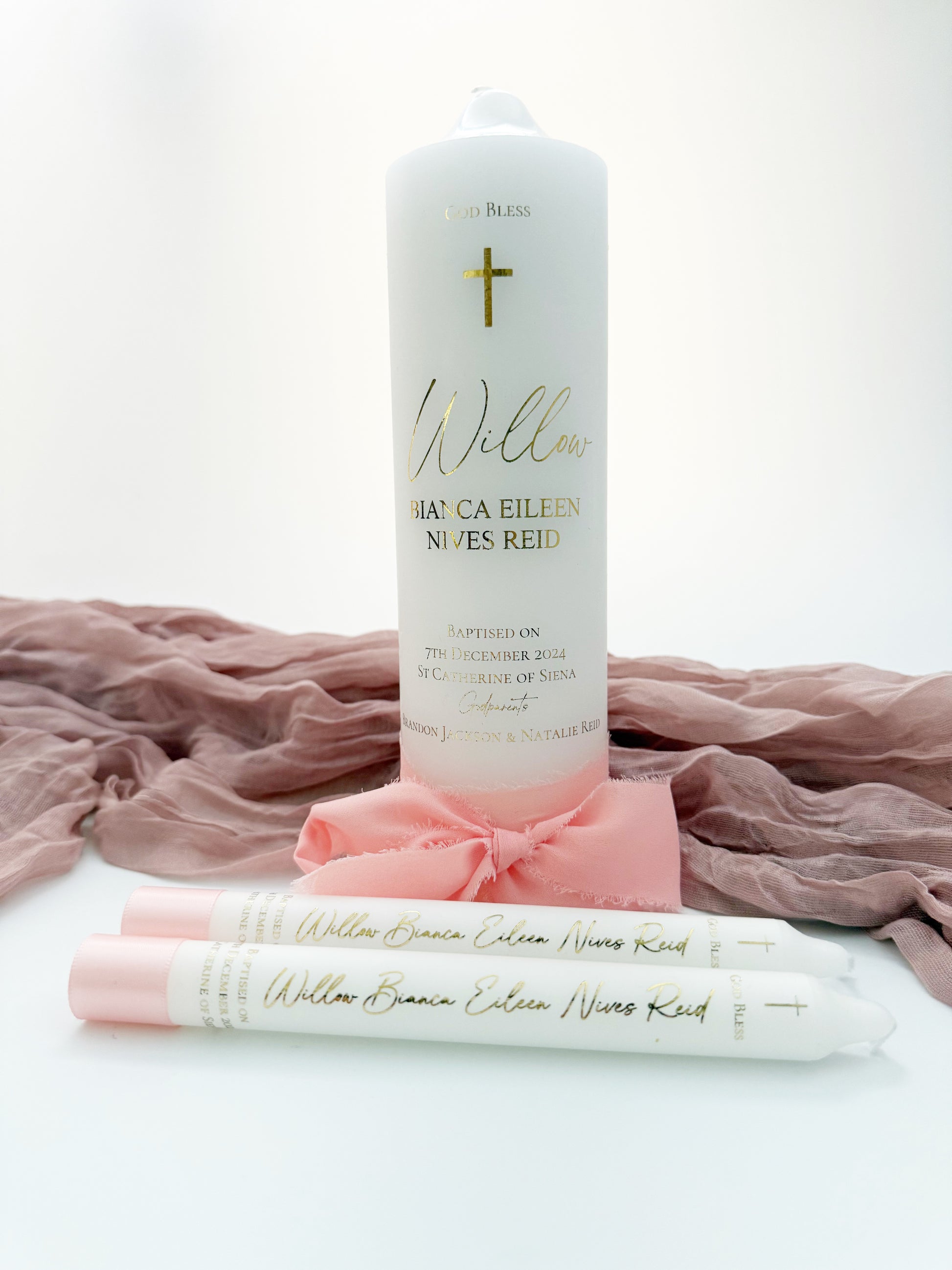 Indulge in the spiritual ambiance created by our 25cm candles, perfect for religious ceremonies and imbued with the sanctity of 2x godparent candles. A thoughtful gift for Christenings, Baptisms, and any other sacred occasions.